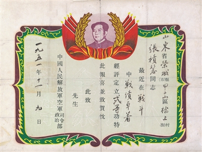在山东博物馆,收藏着一张特殊的喜报。这是1951年11月9日,中国人民解放军空军司令部、政治部发往山东荣成县甲子山区桥上村的喜报,内容是:“张积慧同志最近在战斗中战绩卓著,经评定立二等功,特此报喜,并致贺忱”。这份喜报,记录的正是志愿军空军飞行员张积慧的首次战绩,见证了人民空军在抗美援朝战场上雏鹰奋飞的历史英姿,展现了我军飞行员大无畏的“空中拼刺刀”精神。