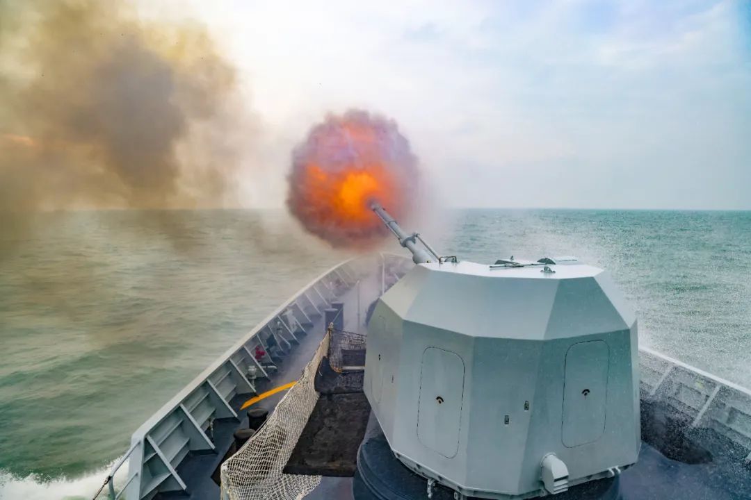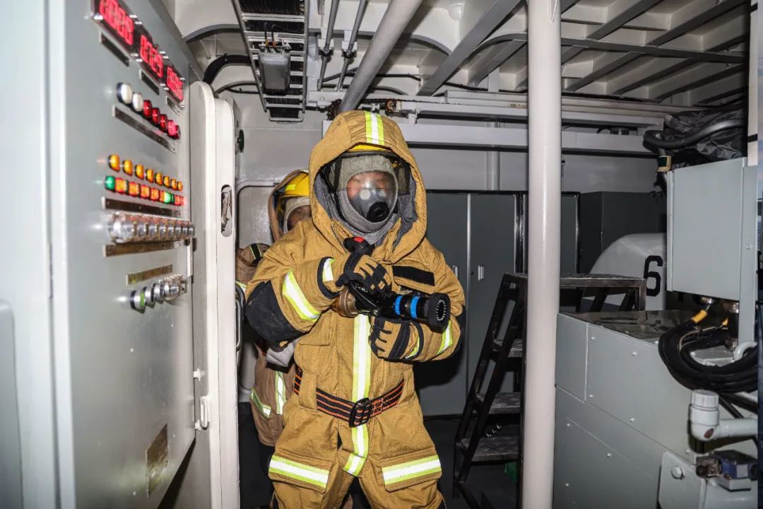 “开火!”随着指挥员一声令下,舰艇立即展开火力打击,精准命中目标。期间,舰艇遭受“敌”打击,相继出现舱室起火、破损进水、仪器失灵等特情,官兵们快速反应,紧急处置突发情况。