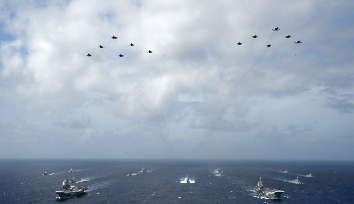 中国2艘航母同框现场:多架歼15战机从辽宁舰起飞