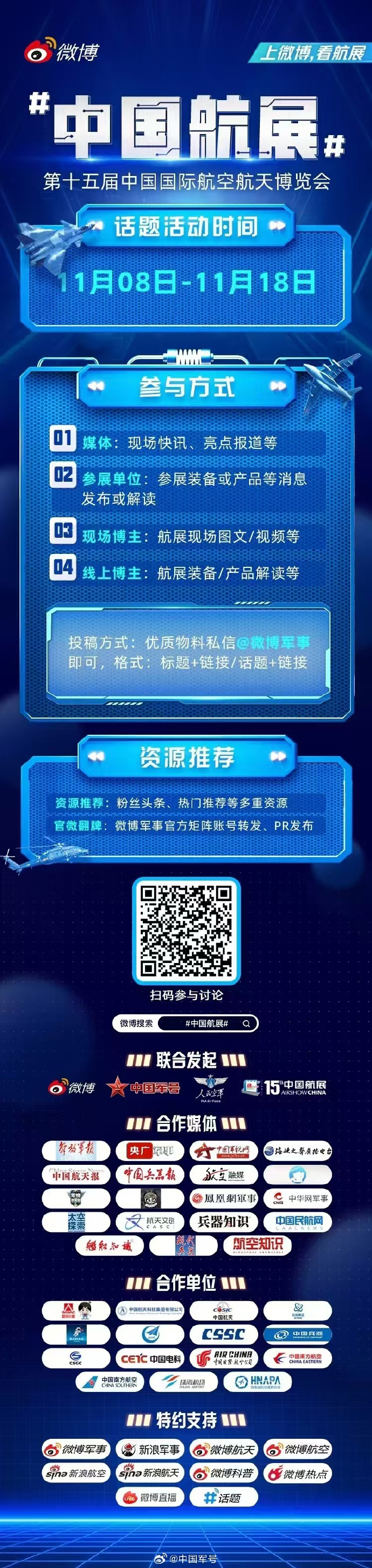为了扩大博览会的影响力,推动国防教育宣传的深入发展,微博联合中国军号、人民空军、珠海航展、中国航空工业集团、中国航天科工、中国航天科技集团等单位共同发起微博话题活动,特别策划并组织了60余位知名大V形成“微博观展团”前往博览会一线进行实地观展。这些大V来自各行各业,他们将通过文字、图片、视频等多种生动形式,向广大网友实时传递博览会的精彩瞬间和航空航天科技的独特魅力。内容将涵盖博览会的各个角落,从先进的战斗机、无人机到最新的卫星技术、航天器,全方位、多角度地展现中国航空航天事业的最新成果和未来发展方向。这不仅将激发公众对国防事业的兴趣和热情,更将增强国民的国防意识和民族自豪感。