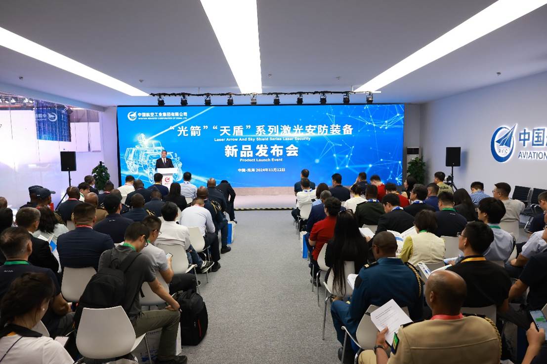 2024年11月12日,中国航空工业集团在第15届珠海航展现场举行的“光箭”、“天盾”系列激光安防装备新品发布会上,展示了最新研发的“光箭”、“天盾”两大系列四款末端防御与低空安防装备。