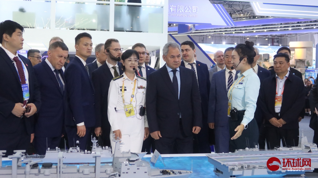 俄罗斯联邦安全会议秘书绍伊古14日上午现身珠海航展,参观了在珠海航展的海军展馆,讲解员介绍了航母和两栖攻击舰群电子沙盘。