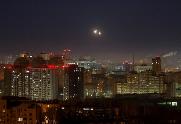 当地时间11月25日,俄无人机袭击期间,基辅上空出现爆炸。 图源:外媒