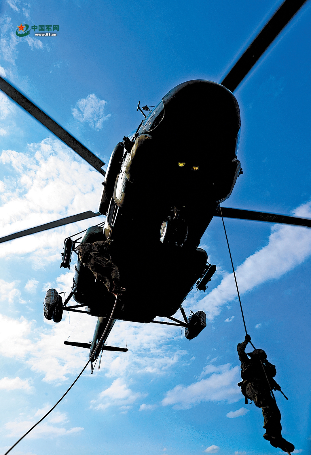 突击队员快速索降。