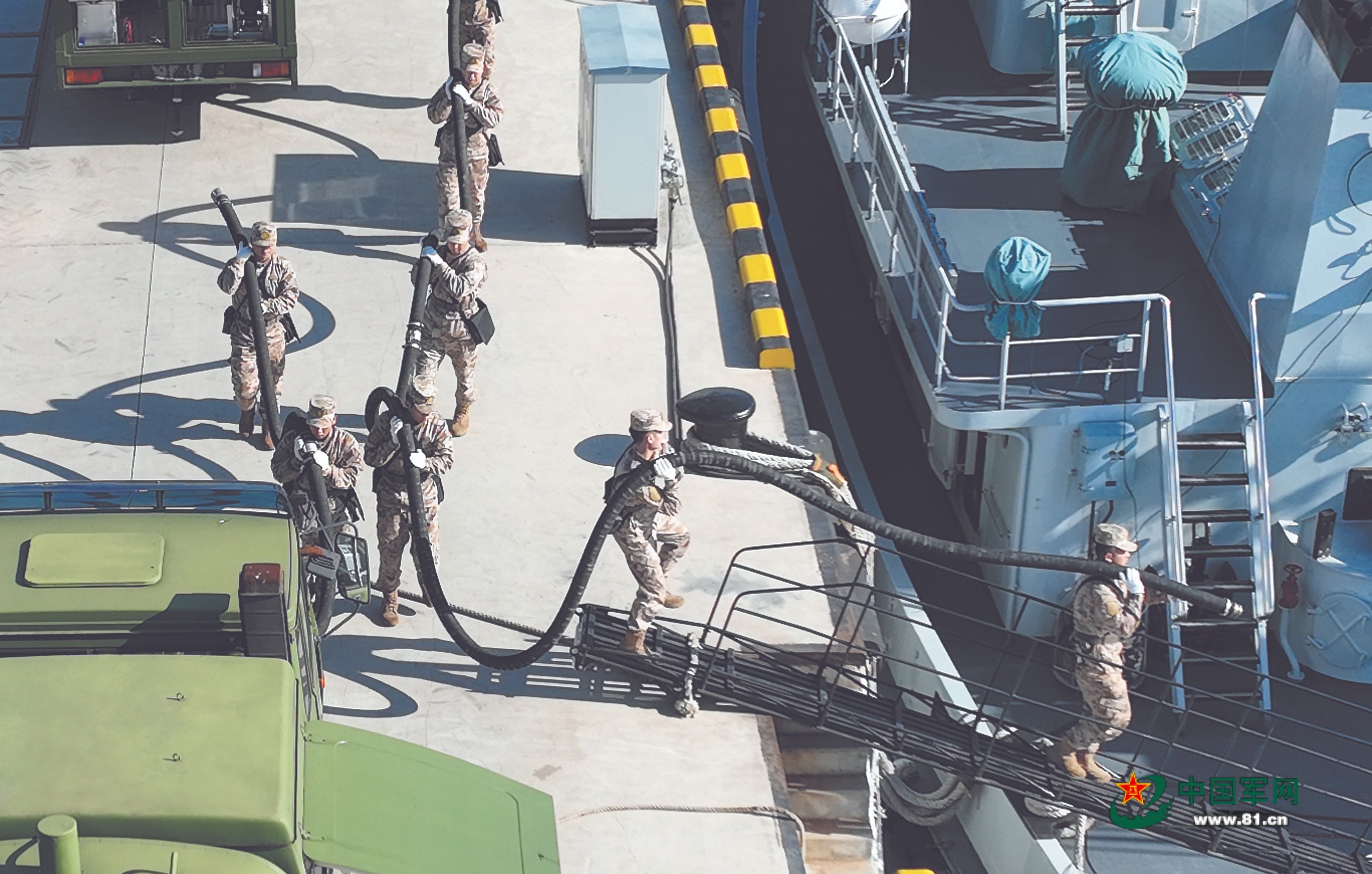 舰艇靠泊完毕,加油车缓缓驶入码头。油料兵迅速铺设输油管路,认真检查每一根油管和每一个接头。现场指挥员下达启泵口令,油料很快注入管道,汩汩输入受油舰艇。