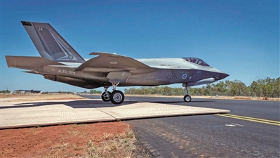 澳大利亚空军F-35A战斗机通过临时铺设的滑行道滑入跑道。