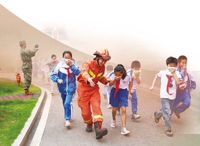 湖南省新田县民兵与县消防救援大队、学校师生进行防灾减灾训练。徐 红摄