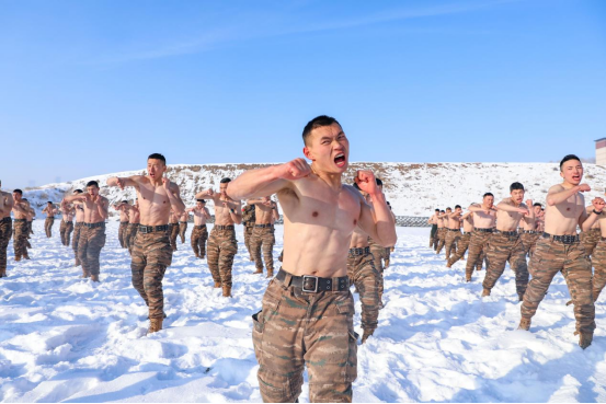 近日,乌鲁木齐气温降至-20℃,在冰雪地的严苛环境中,武警新疆总队某支队的官兵毅然脱掉上衣进行抗寒训练,有效提升了官兵对寒冷环境的适应能力和坚韧的战斗意志。(赵炎明、李杨、张新、蔡季存、董虎)