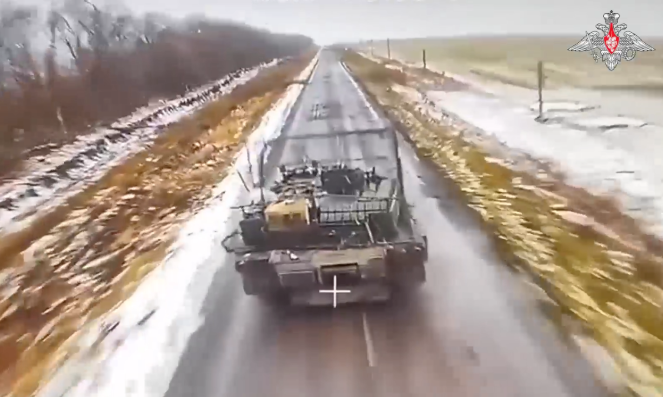 俄国防部18日公布视频称,俄军使用自杀式无人机在库尔斯克州“新伊万诺夫卡”定居点附近击毁了一辆乌军的美制M1A1“艾布拉姆斯”坦克。 图源:俄国防部发布视频截图
