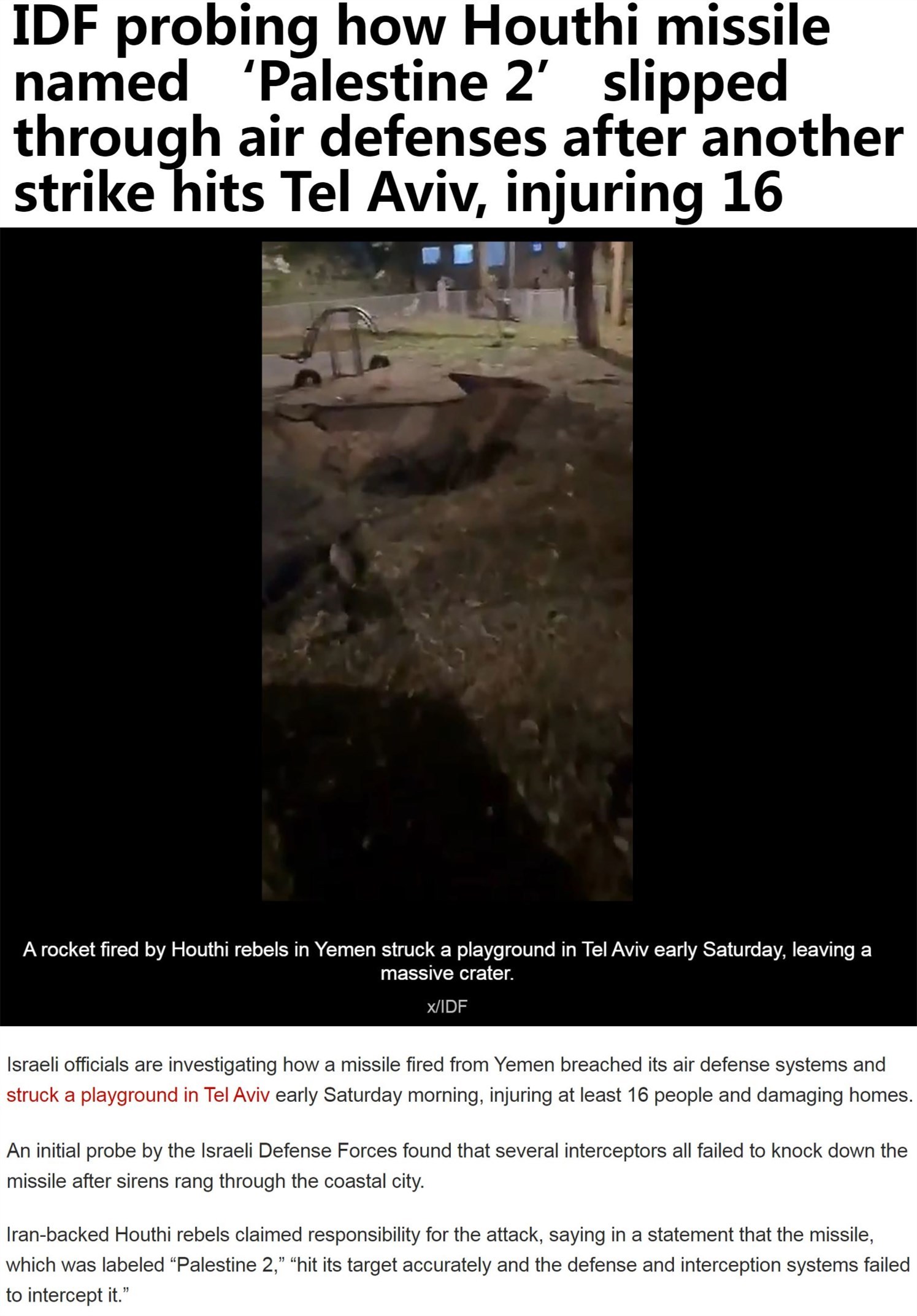 以色列正在谋划对也门胡塞武装进行更多、更大规模的空袭。这次“巴勒斯坦-2”型高超音速导弹成功打到以色列境内的目标,这种导弹实力的展示可能会在一定程度上制衡以色列要对胡塞武装下狠手的想法。(素材来源丨环球资讯广播《直播世界》 记者丨魏东旭)