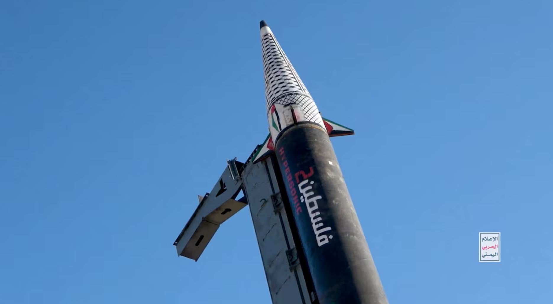 资料图:也门胡塞武装发布的“巴勒斯坦-2”型高超音速导弹图片(图自路透社)