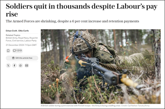 报道援引英国军方提供的数据显示,截至今年10月,英军在2024年已有超过1.5万名英军官兵选择退役,而在同样的时间段,英军仅招募了1.2万人。今年夏天,英军刚给官兵平均涨薪6%,涨薪力度为22年来最高水平,但这一举措仍未遏制官兵的“离职潮”。