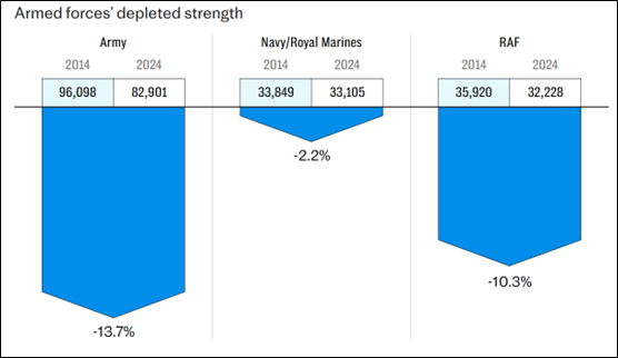 据英军官方数据显示,在过去10年里,英军兵员流失最多的是英国陆军,减员幅度为13.7%,英国空军为10.3%,海军和海军陆战队则为2.2%。