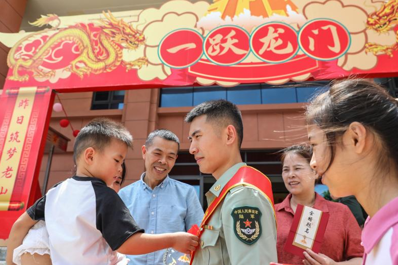 廖一洲:2024年8月16日,我成功考取国防科技大学全日制专升本,部队邀请家人来参加军考欢送会。会后,小外甥好奇的看着我的绶带和胸前的大红花,奶声奶气地说:“我长大了也要像舅舅一样。”