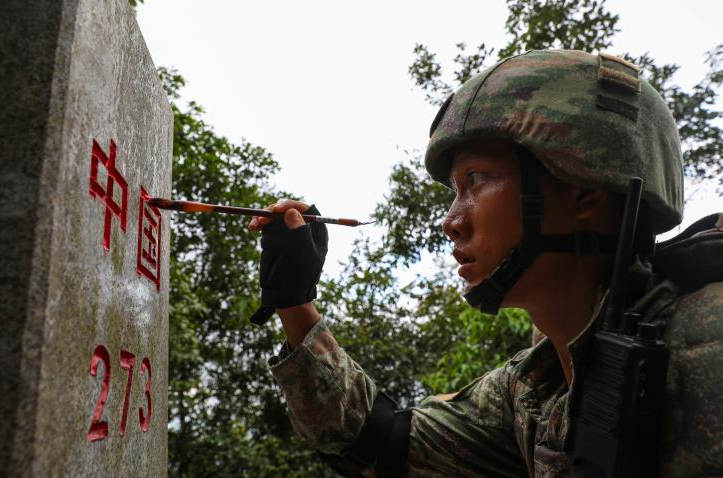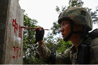 李金豪:2024年8月19日,我跟随连队巡逻分队再次踏上巡逻路,虽然不是第一次为界碑描红,可每当看到鲜红的中国二字出现在眼前,心中仍是自豪无比。