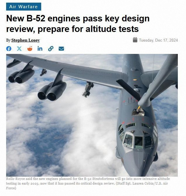新的B-52轰炸机发动机通过关键性设计审查。(美国防务新闻网网站报道截图)