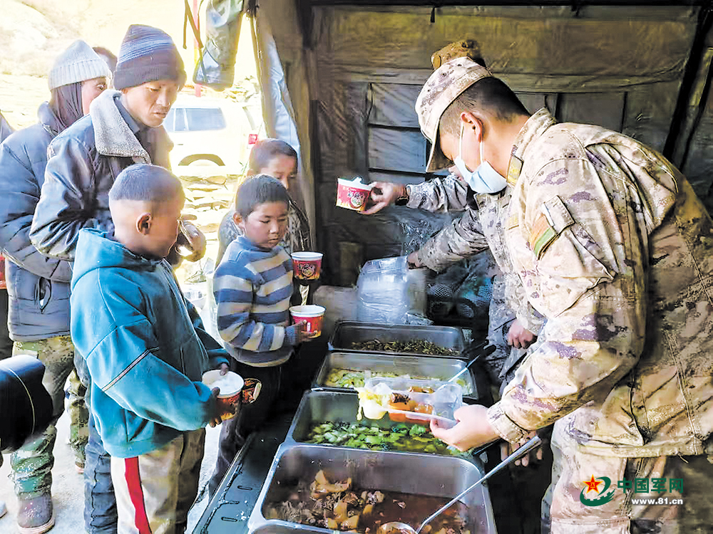 1月8日,西藏军区青藏兵站部官兵在长所乡茶江村开展救援保障工作。图为官兵为受灾群众提供饭菜。普琼摄