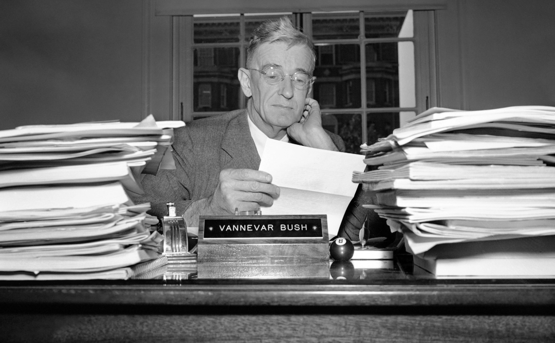 1945年夏天,布什博士基于对二战中科技快速发展和在现实中如何应用的思考,完成了给白宫的名为《科学:无尽的前沿》工作报告,同时还公开发表了一篇题为“诚如所思”的文章。布什博士在“诚如所思”中想象了一个未来设备;“人们可以在其中存储所有的书籍、记录和通信信息,并且以极高的速度和灵活性与这种机械设备进行互动咨询。这种设备是对人本身记忆的直接扩大和补充”。