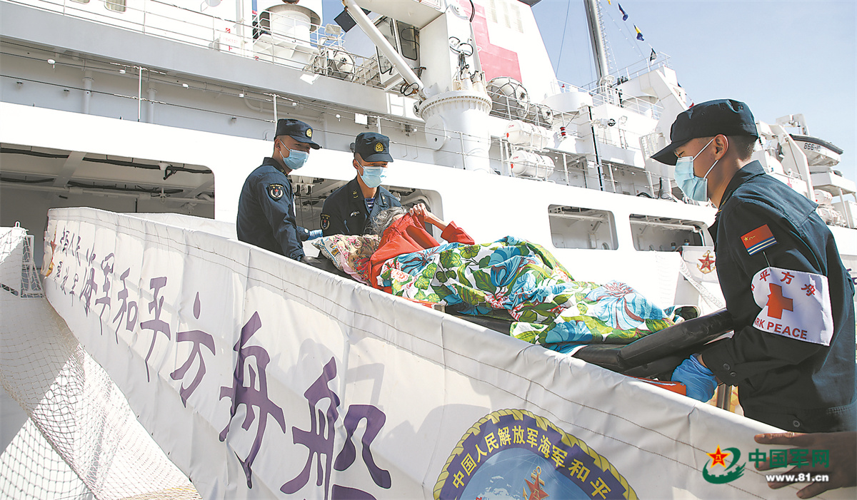 访问马达加斯加期间,和平方舟医院船官兵协助行动不便的患者上船接受诊疗。