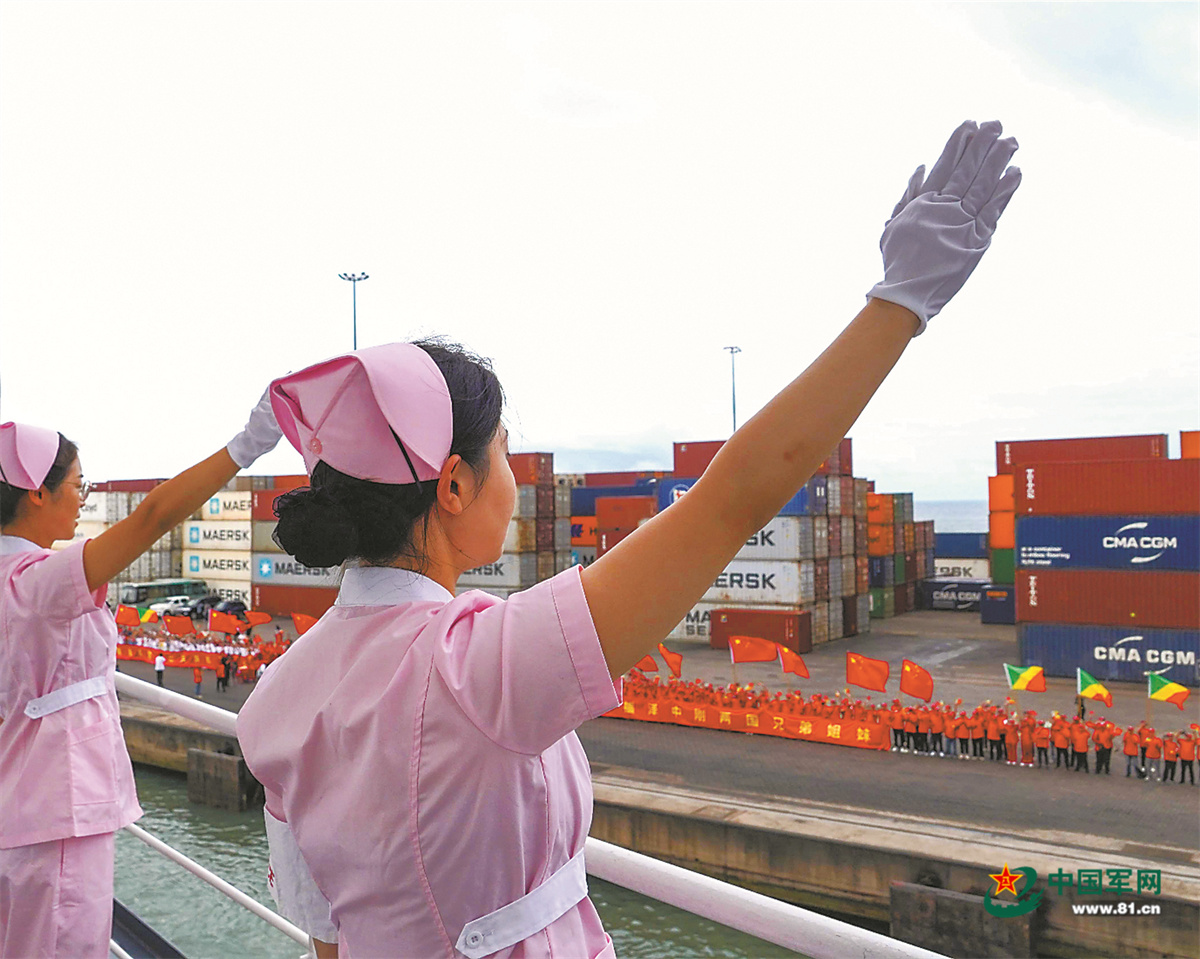 和平方舟医院船抵达刚果(布)黑角港时,医务人员分区列队,向欢迎人群挥手致意。