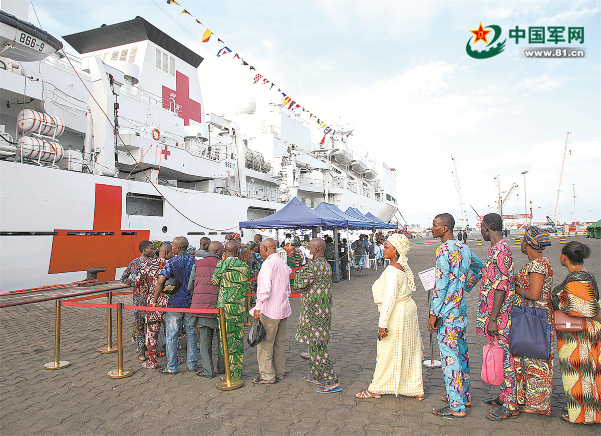 和平方舟医院船在贝宁科托努开展医疗服务期间,当地民众依次就诊。