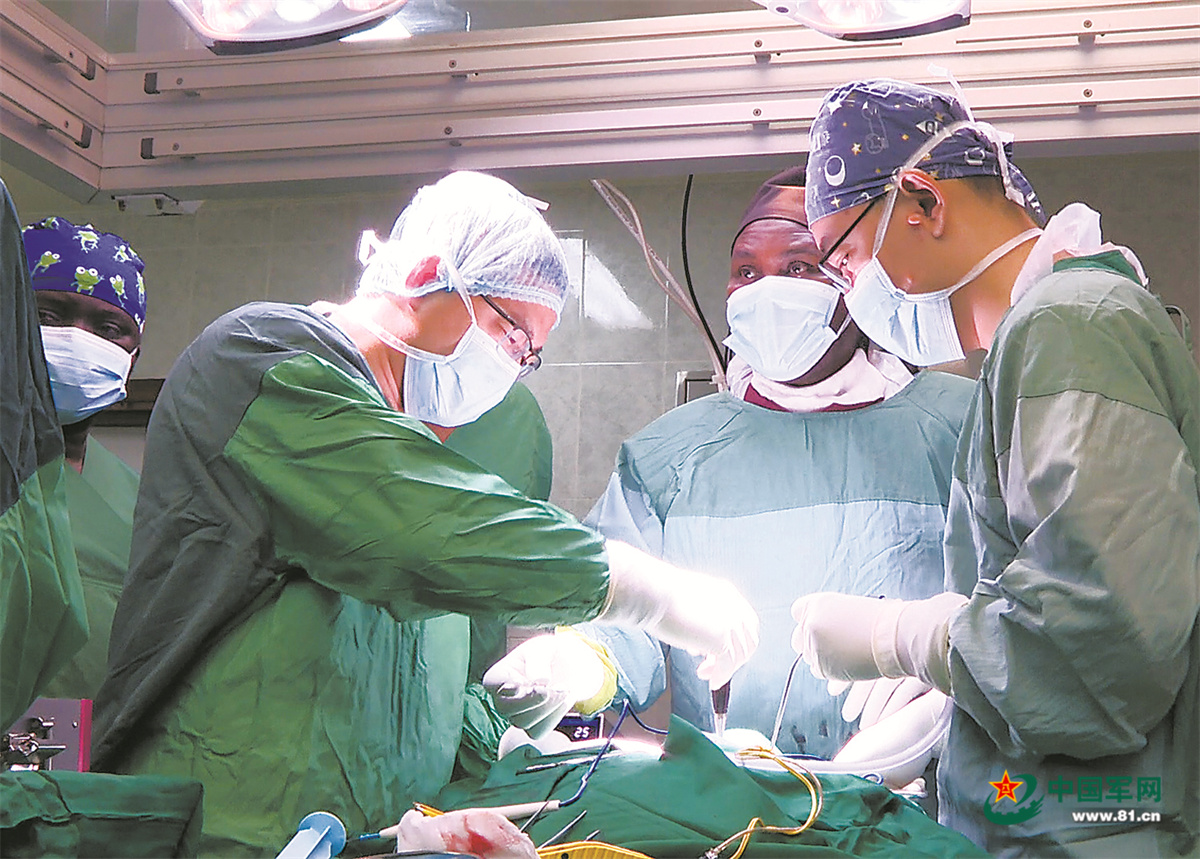 和平方舟医院船医务人员与坦桑尼亚医生联合为当地一名患者实施脊柱侧弯矫正手术。