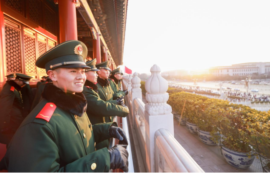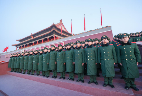 新兵王驰宇激动地说:“第一次登上观礼台观看升国旗,我内心无比激动,亲眼目睹这庄严的仪式让我感到特别自豪。”升旗仪式结束后,新兵们登上天安门城楼。庄严肃穆的古城楼,静静矗立在祖国的心脏,承载着厚重的历史与辉煌的文化。新兵们站在城楼上,迎着微风,心中涌起一股强烈的使命感与责任感。他们轻声交流着,眼神中满是对未来的坚定与憧憬。