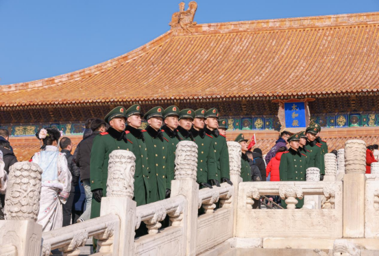 在故宫博物院,新兵们整齐列队,与庄严的紫禁城合影留念。