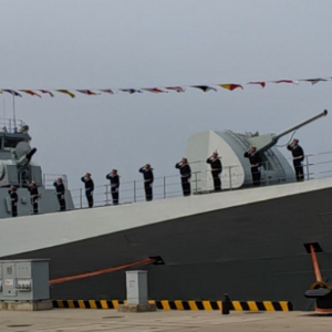 海军054B护卫舰首舰漯河舰22日上午在山东青岛某军港交接入列。