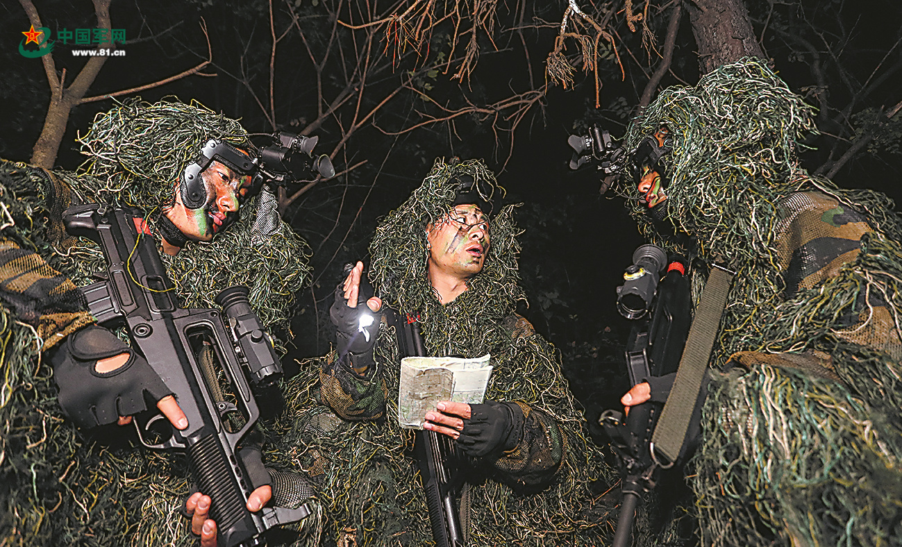随后,常占带领侦察小队保持无线电静默,悄无声息绕过“敌”警戒网,抵达目标点位,完成渗透任务。