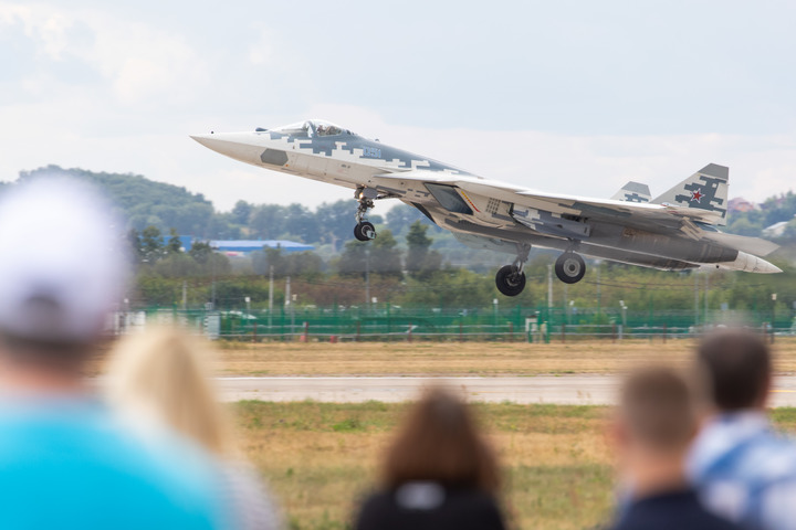这是苏-57战斗机在俄罗斯首都莫斯科附近的茹科夫斯基市完成飞行表演后降落的情景(白雪骐 摄)