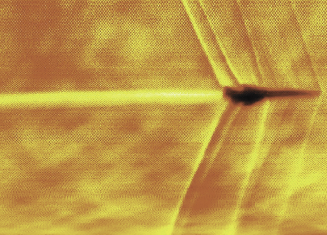NASA用“纹影摄影”技术拍下的XB-1超音速飞行照片。