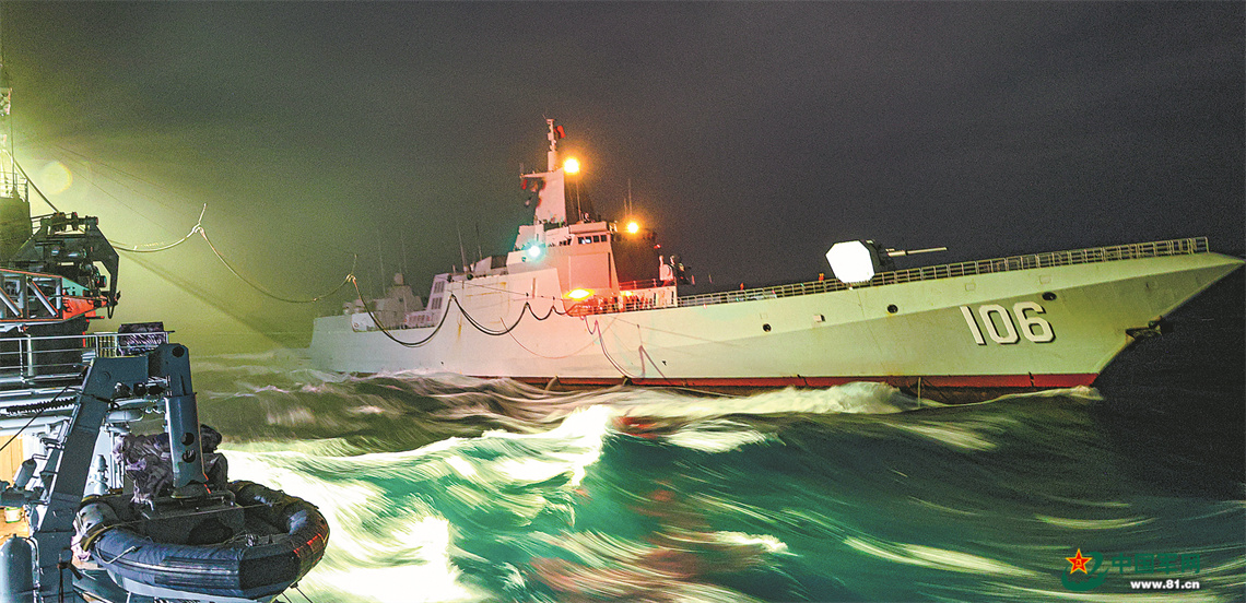 黄昏时分,正在进行损管训练的某舰突然接到补给命令。该舰随即进行战备等级转进,高速机动至目标海域。夜幕垂落,能见度逐渐降低。借助微光,补给舰和受补舰官兵默契配合,精准对接,娴熟操作设备完成补给任务。