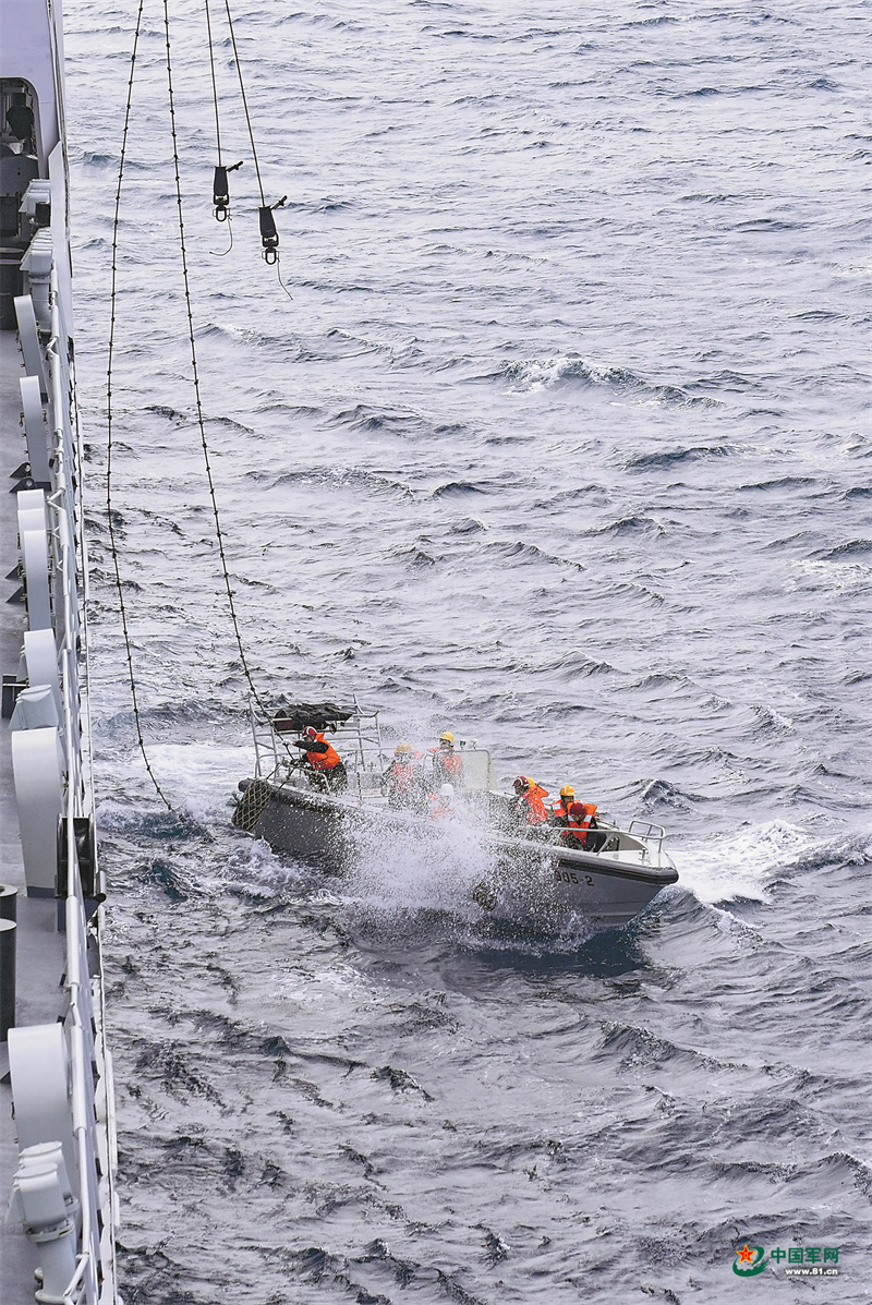 吊放小艇执行搜救任务。