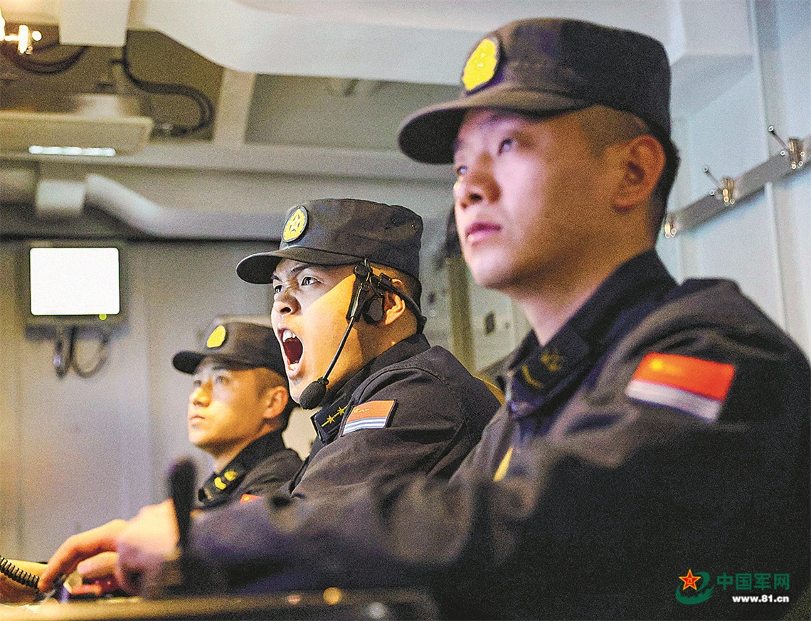 “发现空中目标来袭!”官兵闻令而动,迅速展开部署,进入战斗状态。作战指挥室内,舰长一边下达快速机动规避口令,一边指挥官兵发射干扰弹。官兵熟练操作、密切配合,迅速向不同方向连续发射数枚干扰弹,在战舰周围形成“电磁迷雾”。与此同时,副炮火舌喷涌,成功抗击“敌”来袭目标。