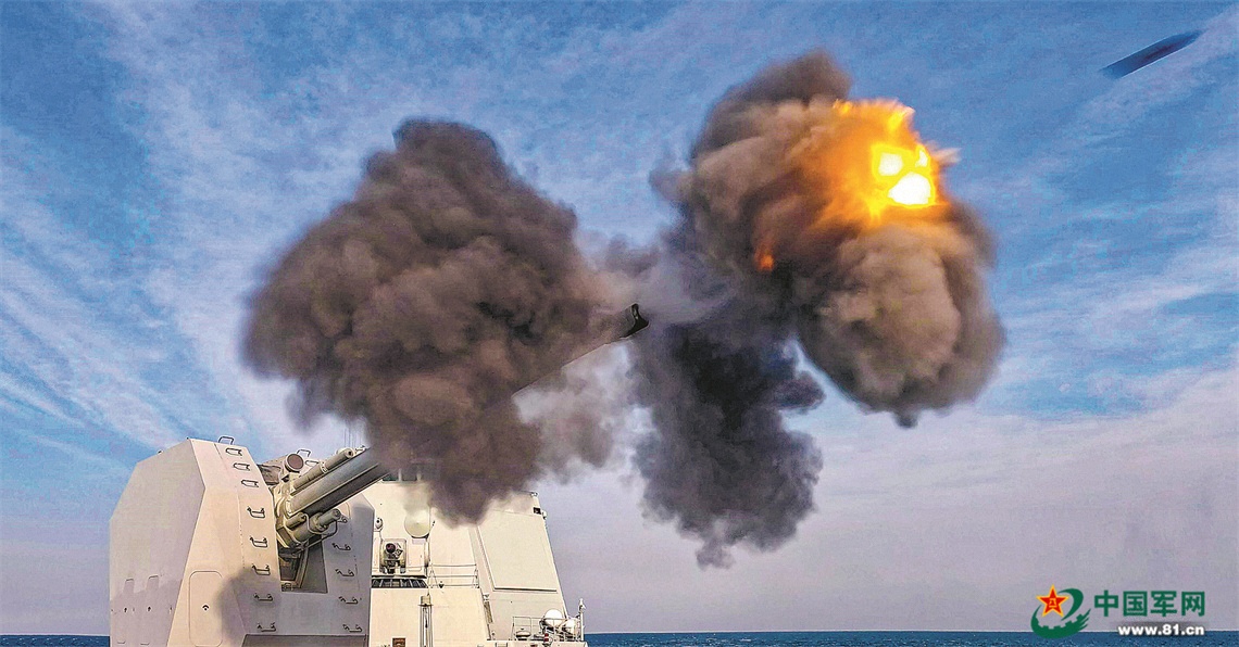 空中威胁刚解除,海上又发现“敌舰”。舰艇大角度调整航向,占领有利阵位。航海部门快速绘算接“敌”航向。锁定目标后,主炮迅疾对目标实施打击。霎时,海面炮声隆隆,硝烟弥漫,目标被一举摧毁。