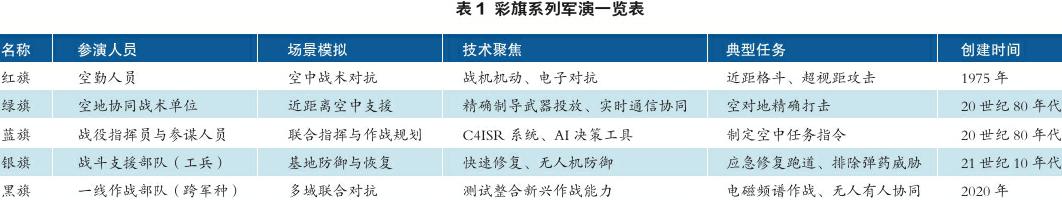 美国空军的彩旗系列军演,一般分为红旗、绿旗、黑旗、蓝旗和银旗五种,其中,红旗演习面向飞行员技能、绿旗演习协同空地作战、蓝旗演习聚焦指挥中枢畅通、银旗演习着眼于后勤支援、黑旗演习追求新战术和新能力。这套从“像实战一样训练”(红旗模式)到“像实战一样去模拟”(黑旗模式)的演进链条,不仅构建了从战术到战略的能力孵化器,更以技术迭代与创新驱动着战斗力持续优势。