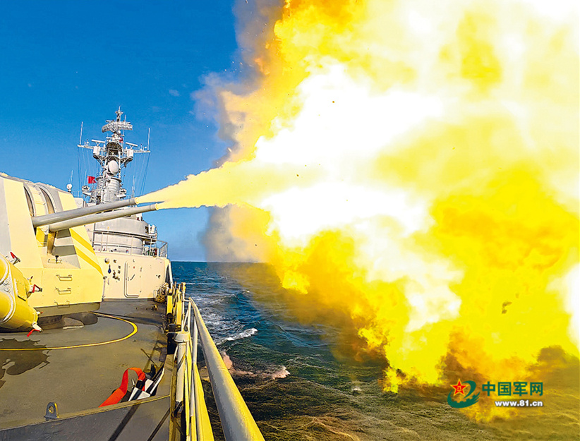 一轮火力打击结束,导调组下达“不明空中目标近飞”特情,舰艇编队立即通过施放烟幕、发射干扰弹等手段,对来袭目标进行干扰。随后,各舰副炮对空中目标实施打击,一条条“火龙”直扑海天……