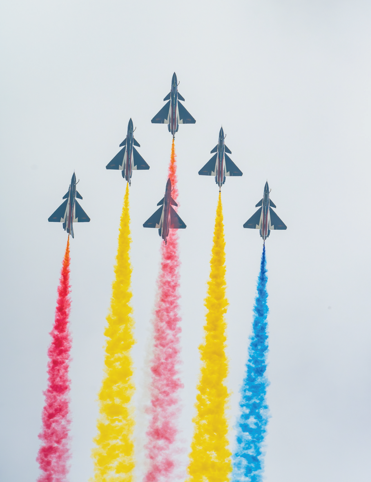 2024年11月,八一飞行表演队在珠海航展上驾驶歼-10C战机进行飞行表演。 (视觉中国)