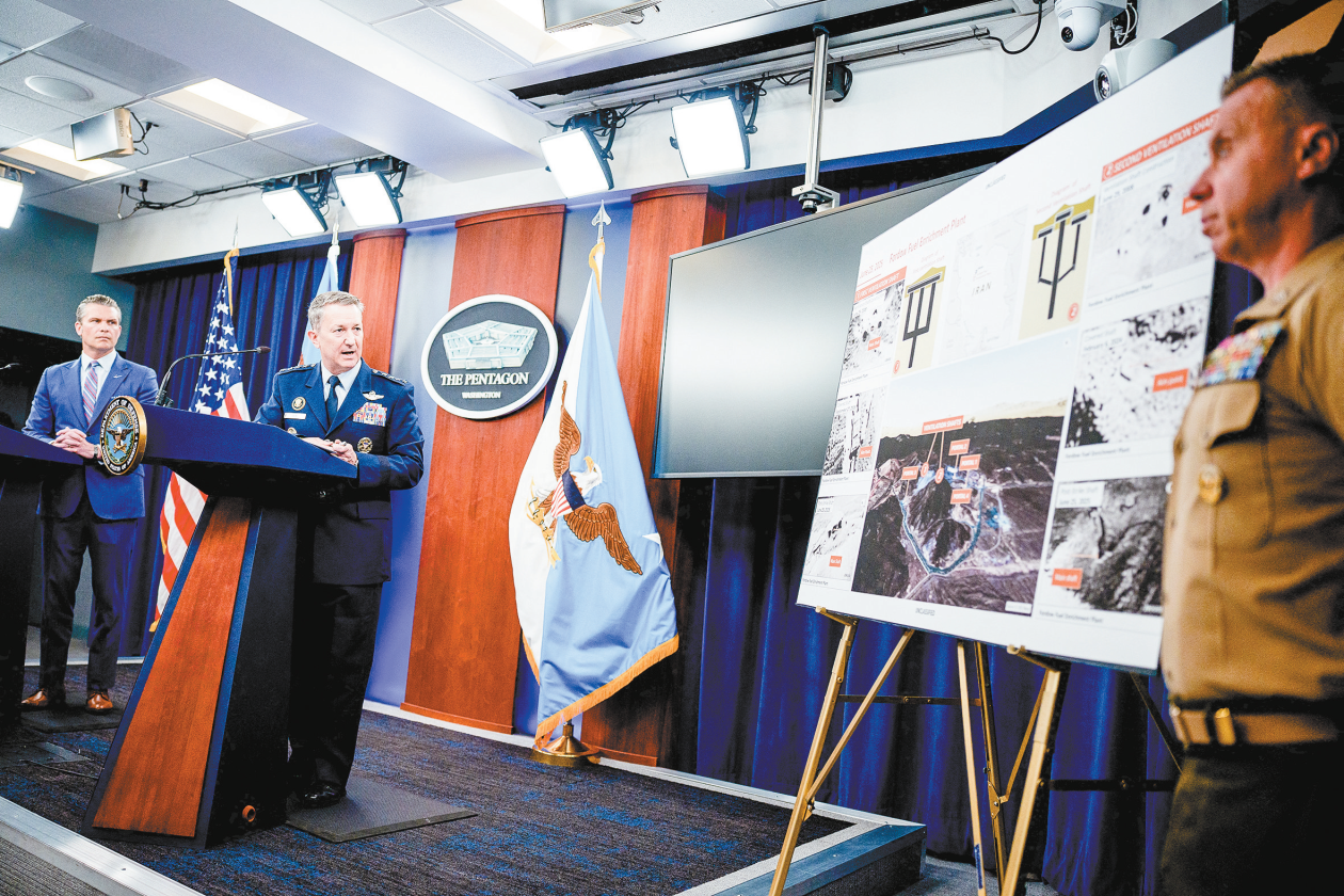 26日,美国防长赫格塞思(左一)、参谋长联席会议主席凯恩在五角大楼举行记者会,称美国21日的袭击“彻底摧毁了”伊朗核设施。(法新社)