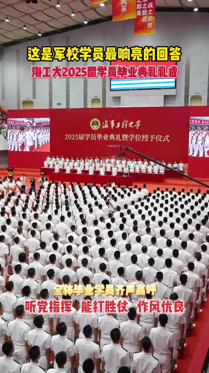 海军工程大学2025届学员毕业典礼现场,全体毕业学员齐声高呼:听党指挥,能打胜仗,作风优良!