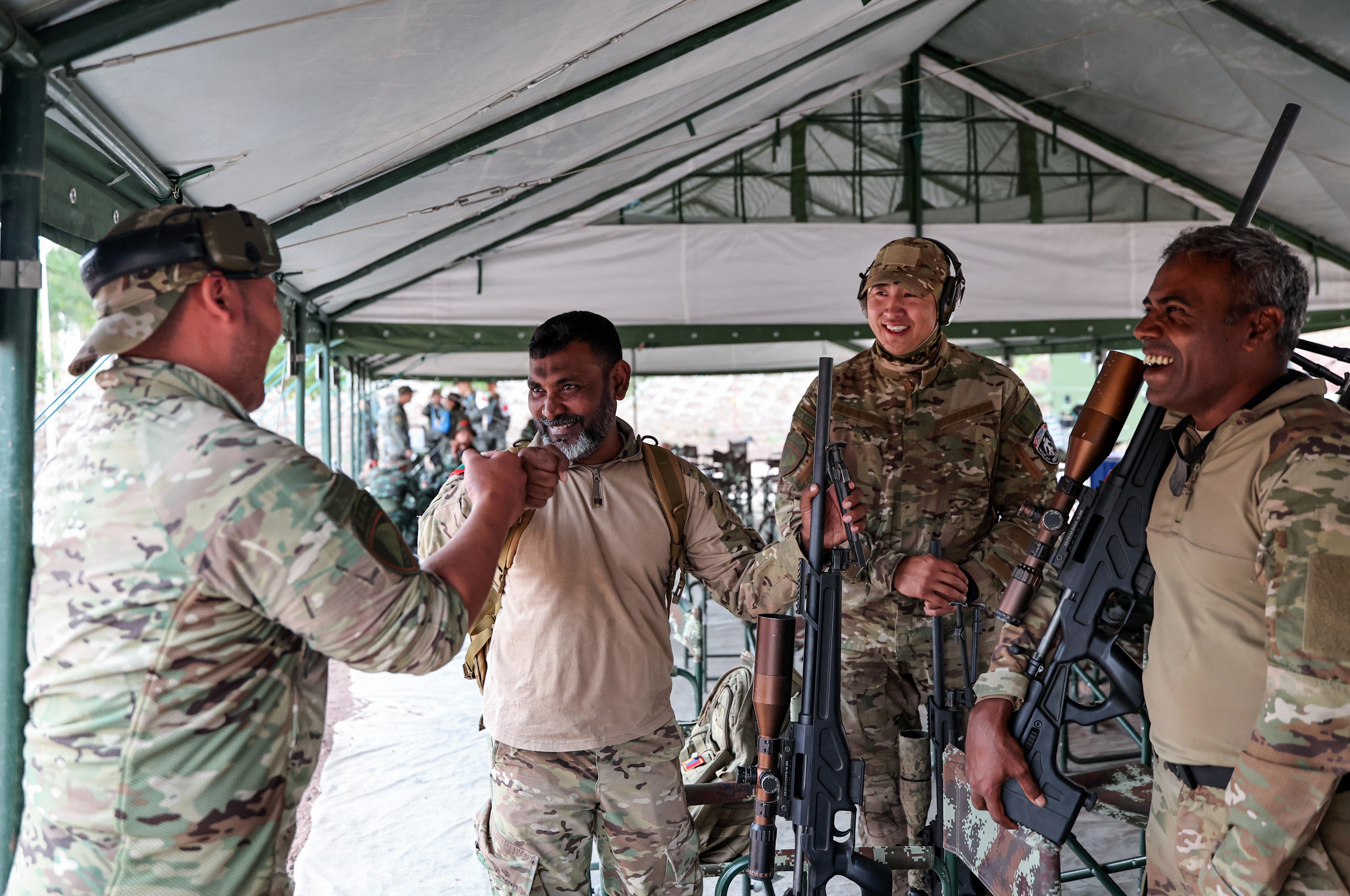 7月15日下午,在位于新疆乌鲁木齐的武警部队某训练基地,参加“锋刃-2025”国际狙击手射击竞赛的各国参赛队员展开激烈角逐。图为参赛队员相互加油鼓劲。侯崇慧 摄