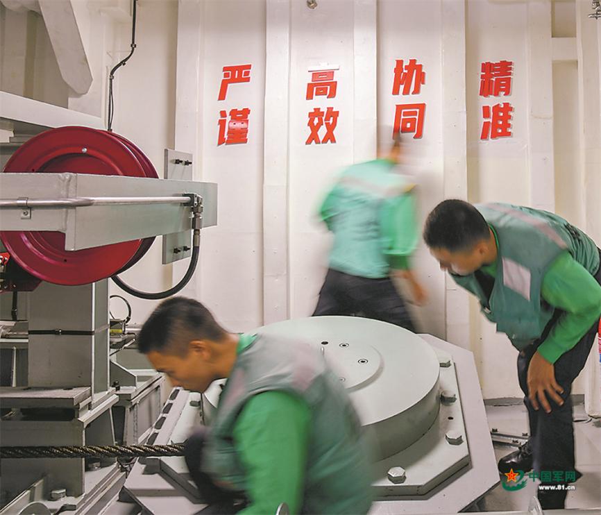 山东舰起降保障中队官兵在阻拦机舱检查相关设施。