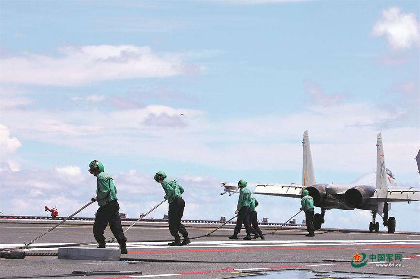 飞机挂索着舰后,推索员进行阻拦索复位保障。