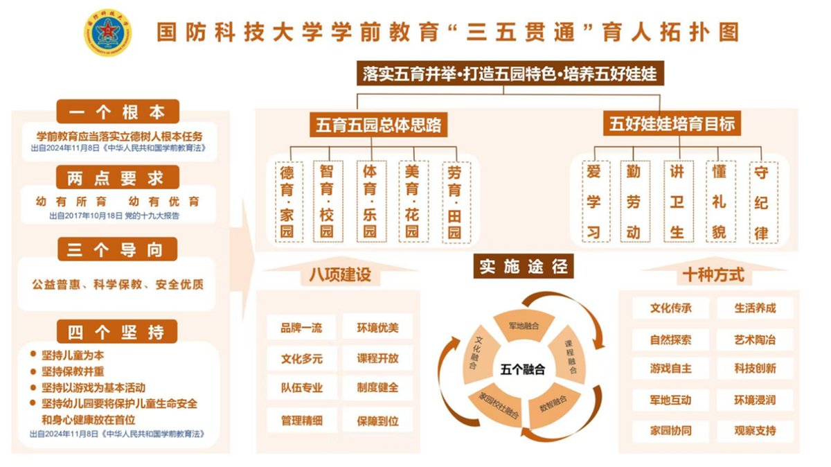 “三五贯通”学前教育育人体系,尽最大努力实现在家园里立德明志、在校园里增添智慧、在乐园里强能健体、在花园里陶冶情操、在田园里实践成长,既是稳军心惠民生的务实举措,也是拴心留人、引才聚才的有效手段,推动国防科技大学的子女教育工作进入了全新的发展阶段。