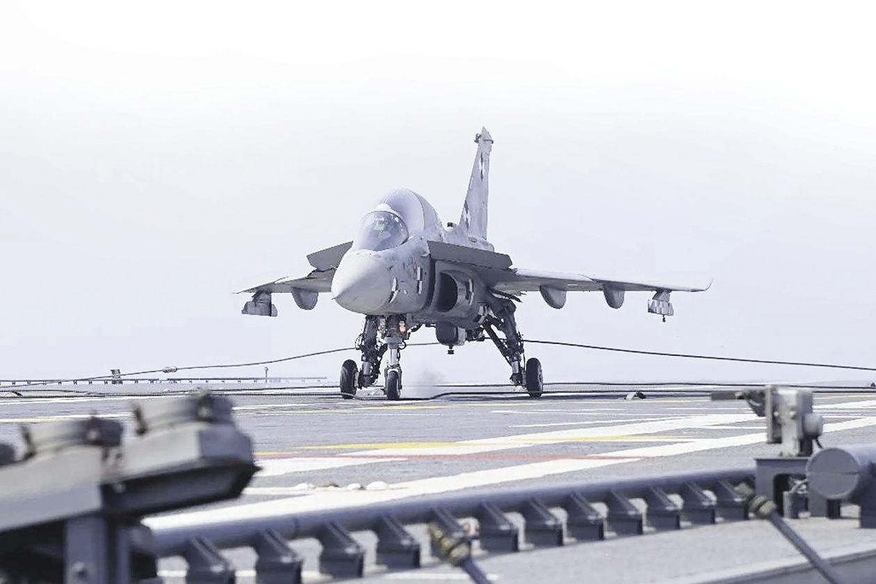 “光辉”战机舰载版在印度国产航母上降落的画面 (图源:印度海军)