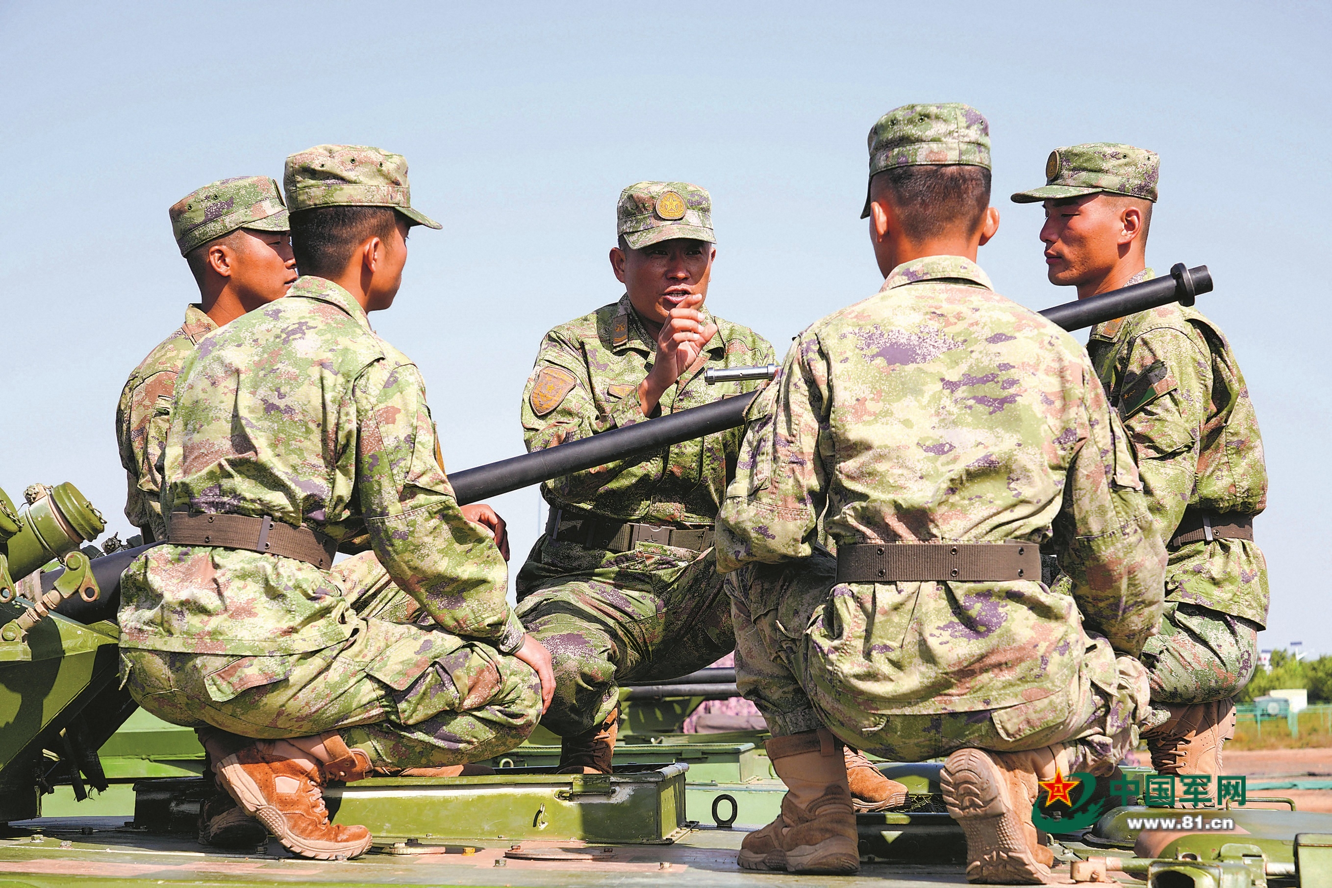 官兵在训练场研究战术战法。