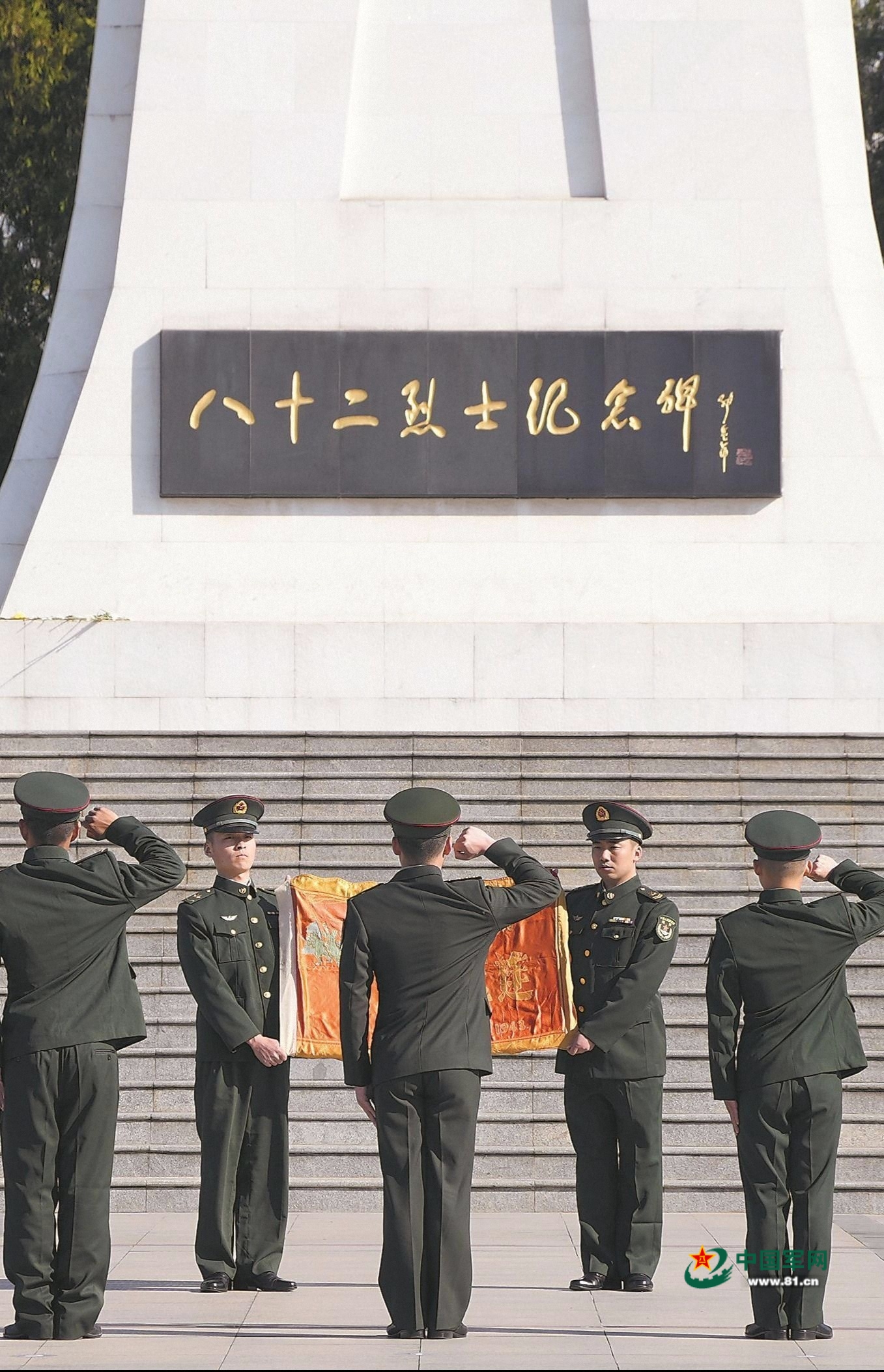 2025年3月18日,连队官兵代表前往刘老庄八十二烈士陵园参加纪念活动。图为官兵代表在烈士纪念碑前向战旗宣誓。杨仕伟 摄