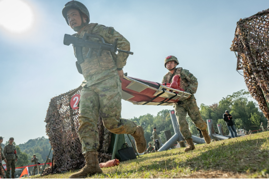 比赛场上,38支队伍展开一场“理论+实操”的技能比拼。此次比武的理论部分重点考察战伤自救互救技术基础知识;实操部分则模拟战场环境下的止血、包扎、固定、搬运以及心肺复苏等项目。重点考验了参赛人员在复杂战场环境下,迅速开展自救互救的能力。