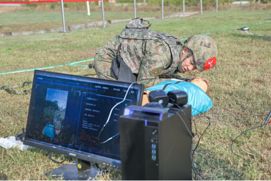 比赛过程中,由国防科技大学自主研发的“火眼金睛”智能裁判员成为了焦点。一个小小的摄像头、一块电子显示屏组成的“智能化训练考核系统”,就能精确无误地为救护员们的救护动作评估打分。随着赛程如火如荼地进行,一个又一个参赛队伍的救护员们分别在不同点位完成战场特情下的紧急救护。看似不起眼的智能裁判员便展现出惊人的能力,止血、包扎、固定……救护员们的每一个动作都被它精准捕捉,识别、分析、计算,经过系统核算迅速得出成绩,大大提高了比武的效率,确保了整场比武的公平性。